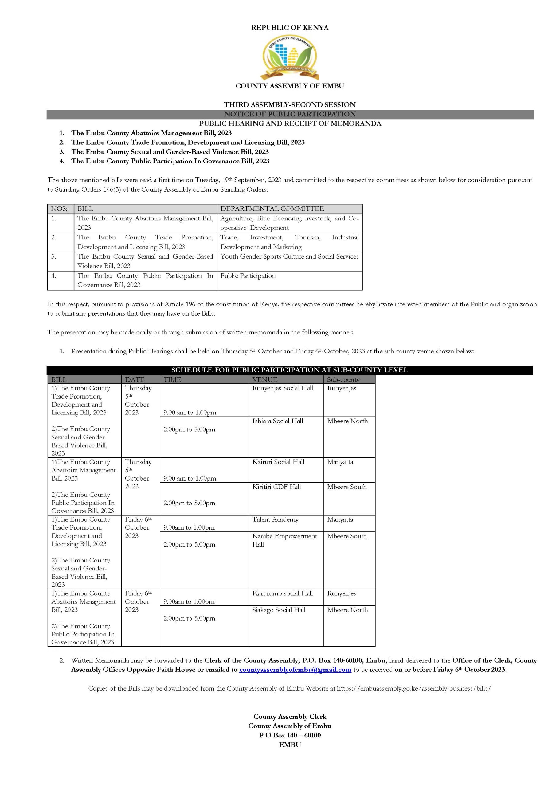 Notice of Public Participation on Bills Public Participation September 29, 2023October 31, 2023 Victor Njue1521